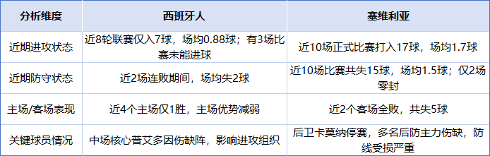 · 西班牙人进攻乏力:他们近期进攻端明显陷入困境,场均不足1球的效率,面对即使不完整的塞维利亚防线,要想多进球也并非易事。