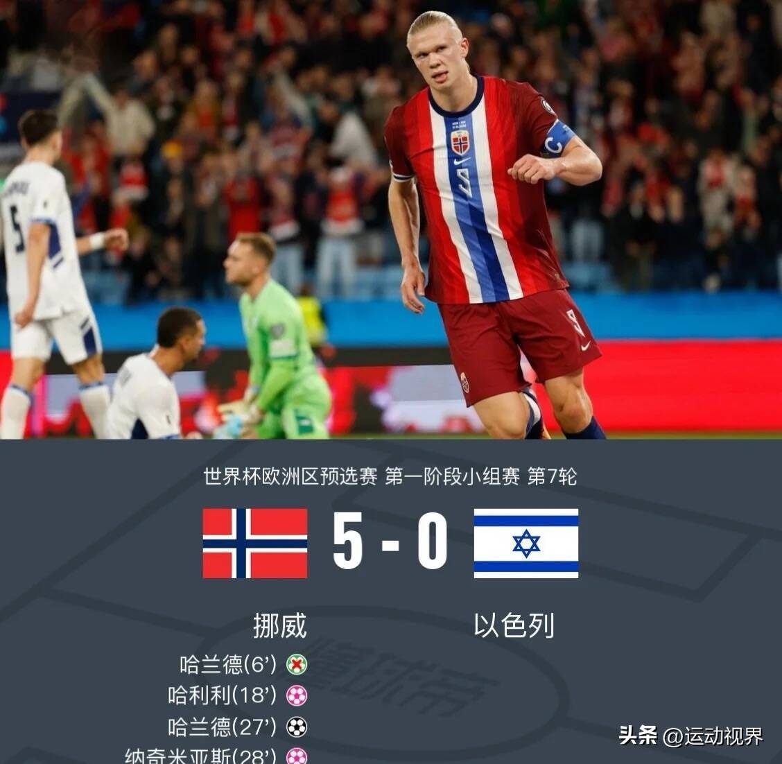 挪威国家男子足球队在主场与以色列队进行世界杯预选赛,比赛第17分钟,以色列防守球员哈莱利在解围时将球顶入本方球门。第26分钟,挪威队通过反击由瑟尔洛特直塞,哈兰德在禁区完成低射破门。第62分钟,挪威队从左路传中,哈兰德头球攻门得分。第72分钟,哈兰德再次通过头球完成本场第三次破门。