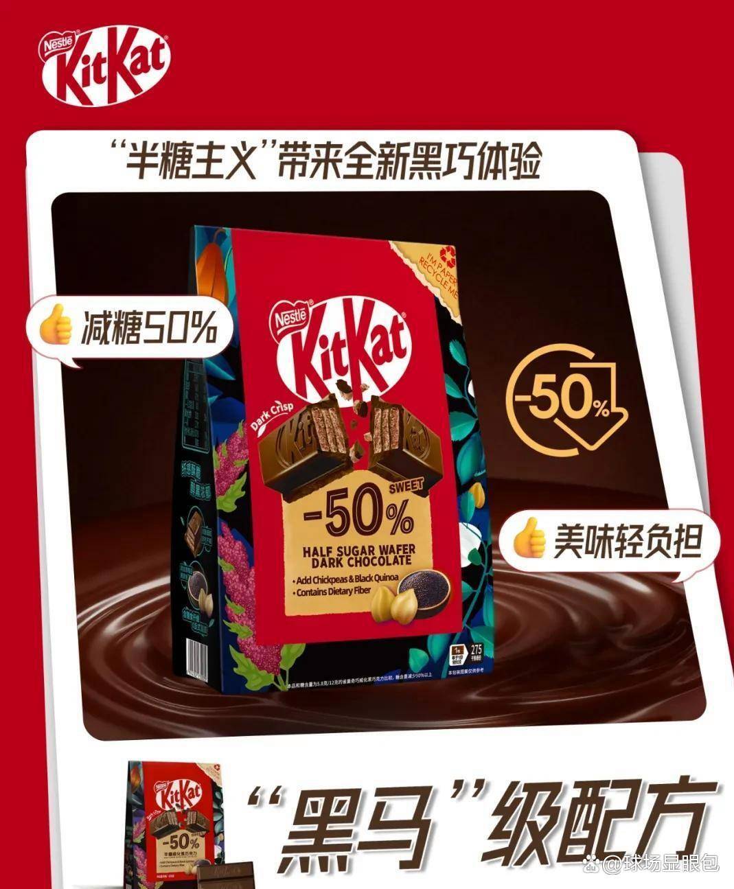 这款减糖50%的产品配方特别添加鹰嘴豆和黑藜麦两种明星原料,含膳食纤维,0反式脂肪酸,采用可回收包装,精准契合控糖人群需求。